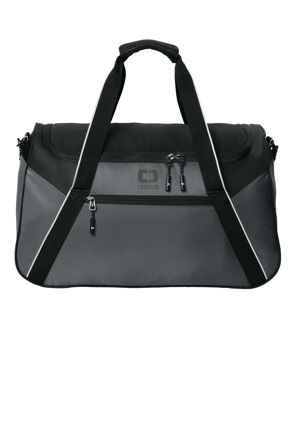 200D poly wave dobby PVC 200D recycled RPET poly mini grid dobby PU Padded wrap handle Interior left and right mesh storage pockets Contrast tipped webbing Zippered front pocket Removable, adjustable padded shoulder strap with black reflective OGIO heat transfer Luggage trolley pass through on back Padded foam bottom for strength Black reflective O icon heat transfer on front Dimensions: 12’h x 21’w x 12’d Capacity: 2,685 cu. in./44 L Weight: 1.43 lbs./0.7 kg Note: Bags not intended for use by children 12 and under.