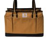 This rugged tote is versatile enough to lug around all your work gear, keep near your work bench or toss in the truck and haul everything you need-regardless of light rain. Made from durable heavyweight canvas, this ultra-tough tote never stops performing. A sturdy base helps ensure it can stand on its own. 600D rugged polyester Rain Defender ® durable water repellent (DWR) Large opening into main compartment Dual webbing haul handles with comfort grip 11 exterior pockets, 6 interior pockets and 7 interior loops Sturdy base to help tote remain upright Carhartt label sewn on front Capacity: 14L Dimensions: 9.5’h x 13.5’w x 8’l; Approx. 854 cubic inches Note: Bags not intended for use by children 12 and under.