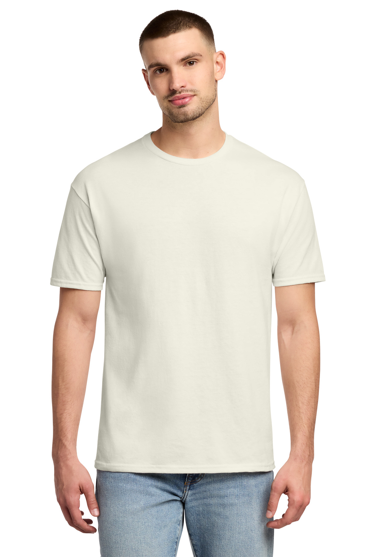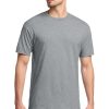 5.4-ounce, 50/50 cotton/poly 47/53 cotton/poly (Oxford) Advanced moisture management performance Tear-away label 1×1 rib collar with clean neckline Double-needle coverstitching on front neck Shoulder-to-shoulder taping Double-needle sleeves and hem Ash (formerly Birch)