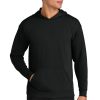Balancing polyester performance with cotton comfort, this long sleeve hooded tee constructed from recycled materials has a rich, soft feel. 4.1-ounce, 65/35 recycled polyester/cotton Moisture-wicking Odor-resistant Stain-resistant Self-fabric hood, cuffs and hem Front pouch pocket Tear-away label
